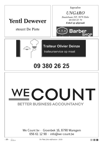 kapsalon UNGARO Staatsbaan 205, 9870 Zulte Yentl Dewever Enkel op afspraak 09/388 85 70 steunt De Piste SHOP We Count bv • Groenbek 16, 8790 Waregem 056 61 12 90 • info@we-count.be - 20 - De Piste Zulte wijkfeesten - 2025