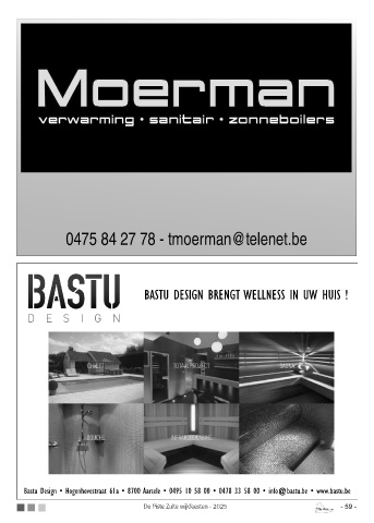 0475 84 27 78 - tmoerman@telenet.be BASTU DESIGN BRENGT WELLNESS IN UW HUIS ! Bastu Design • Hogenhovestraat 61a • 8700 Aarsele • 0495 10 58 00 • 0478 33 58 00 • info@bastu.be • www.bastu.be De Piste Zulte wijkfeesten - 2025 - 59 -