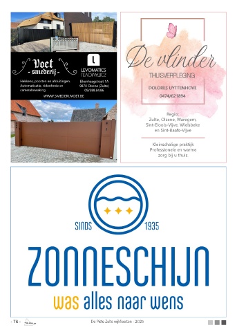 De vlinder DOLORES UYTTENHOVE 0474/621894 Regio: Zulte, Olsene, Waregem, Sint-Eloois-Vijve, Wielsbeke en Sint-Baafs-Vijve Kleinschalige praktijk Professionele en warme zorg bij u thuis. - 76 - De Piste Zulte wijkfeesten - 2025